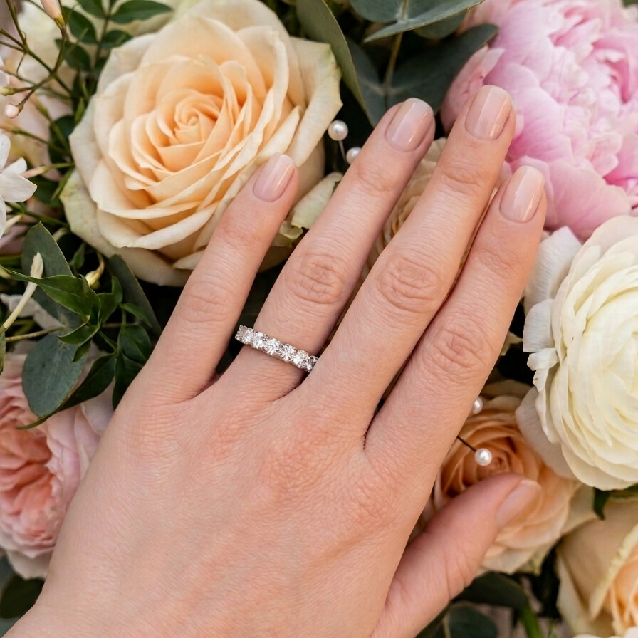 Délicate et lumineuse, cette alliance se distingue par une ligne continue de diamants finement sertis, offrant un scintillement pur et régulier à chaque mouvement de la main. Chaque pierre, sélectionnée avec exigence, révèle une brillance exceptionnelle, sublimée par un sertissage précis qui maximise la diffusion de la lumière.