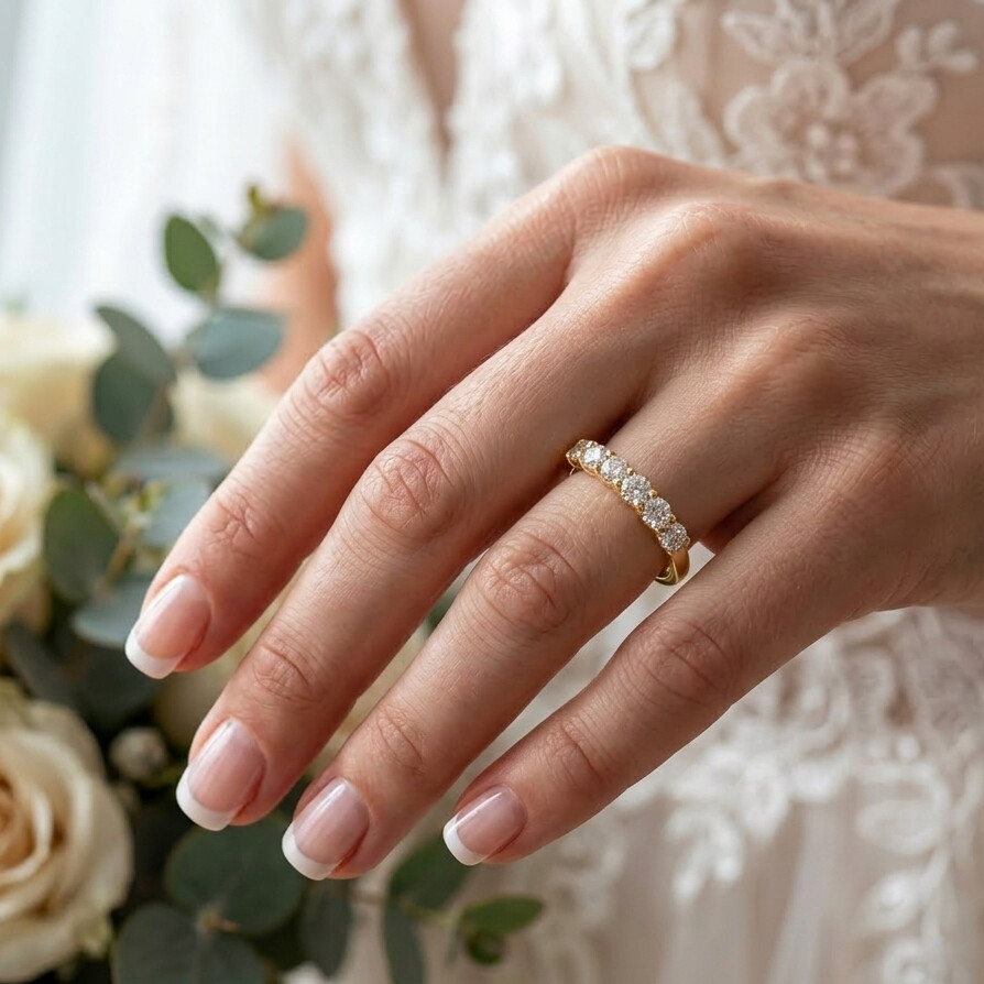 Élégante et intemporelle, cette bague demi-alliance se distingue par la pureté de ses lignes et l’éclat de ses pierres. Réalisée en or jaune poli, elle est sublimée par une rangée de diamants soigneusement sélectionnés, sertis griffes pour maximiser la diffusion de la lumière.