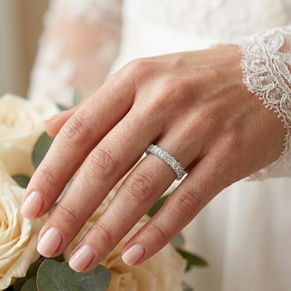 D’une élégance absolue, cette bague en or blanc incarne le raffinement de la haute joaillerie contemporaine. Son anneau fin et délicatement poli sert d’écrin à une ligne continue de diamants taille princesse, soigneusement sélectionnés pour leur pureté exceptionnelle et leur éclat cristallin.