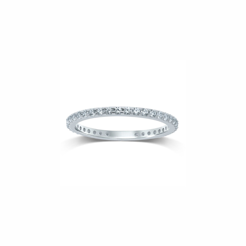 Délicate et lumineuse, cette alliance en or blanc révèle un raffinement absolu. Son anneau fin et poli accueille une ligne harmonieuse de diamants ronds, minutieusement sertis en griffes pour capter et diffuser la lumière à chaque mouvement.