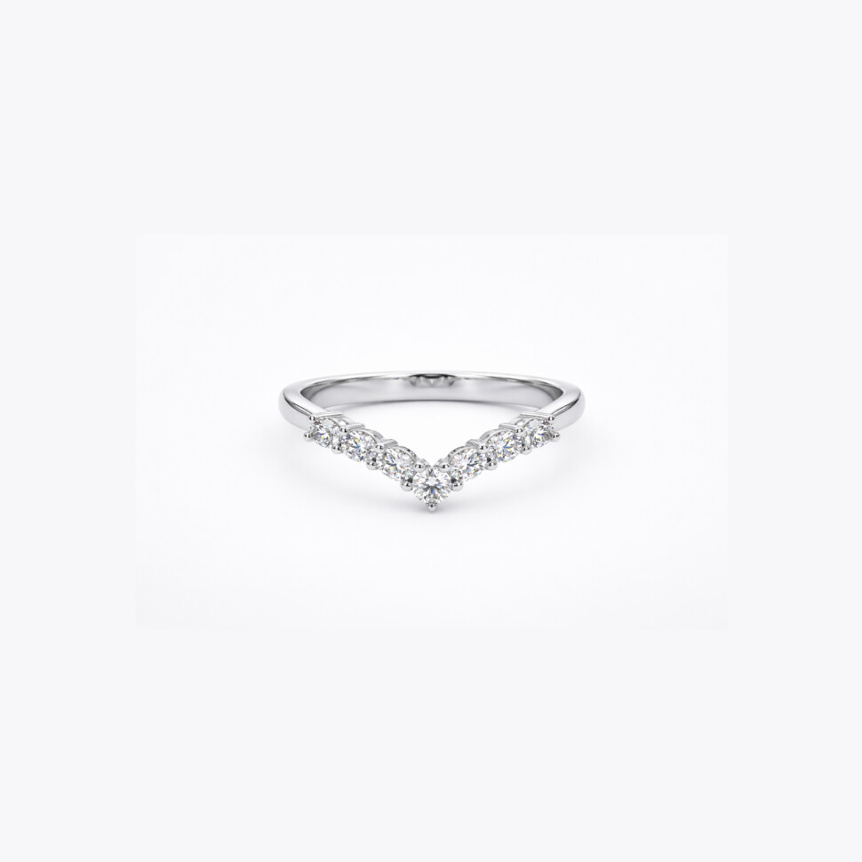 Délicate et lumineuse, cette bague en or blanc séduit par son design en forme de V finement sculpté, symbole d’élégance contemporaine. Sa ligne graphique épouse naturellement la courbe du doigt et met en valeur une rangée de diamants ronds taille brillant soigneusement sertis.