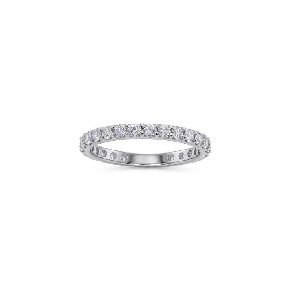 Délicate et lumineuse, cette alliance en or blanc révèle un raffinement absolu. Son anneau fin et poli accueille une ligne harmonieuse de diamants ronds, minutieusement sertis en griffes pour capter et diffuser la lumière à chaque mouvement.