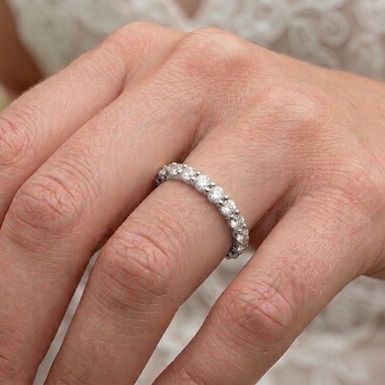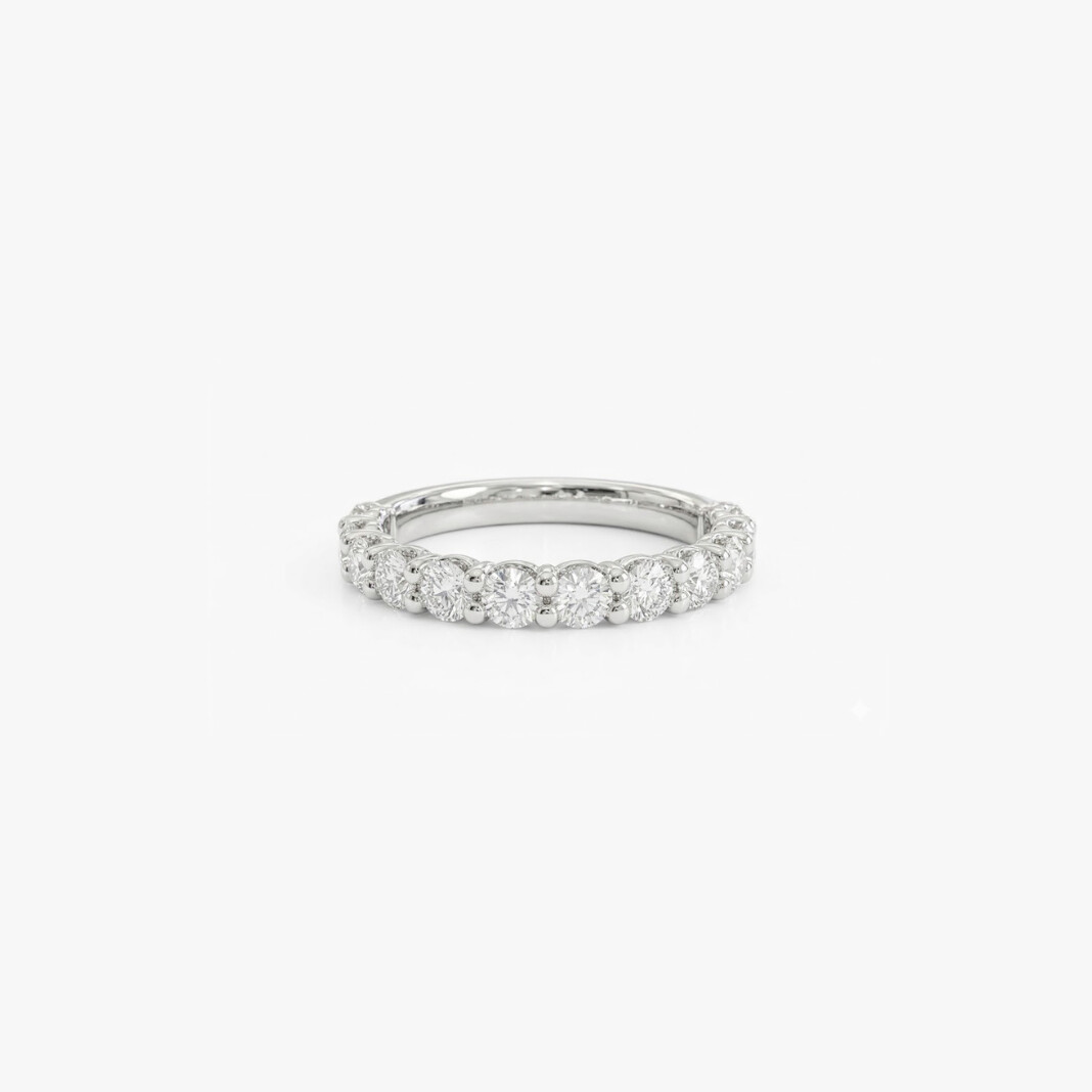Les pierres, alignées avec précision sur le dessus de l’anneau, créent un effet scintillant continu, tout en conservant une grande finesse visuelle. Le sertissage met en valeur chaque diamant individuellement, tout en assurant une tenue solide et discrète.