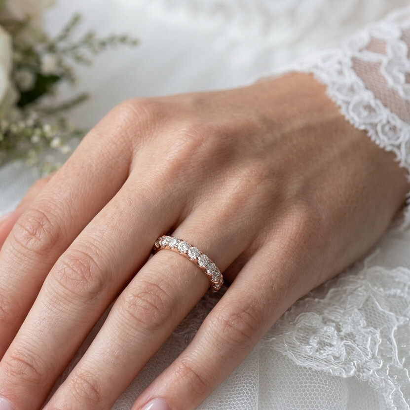 Élégante et intemporelle, cette alliance en or jaune 18 carats séduit par l’éclat raffiné de ses diamants naturels soigneusement sertis. Son design délicat met en valeur une ligne harmonieuse de 12 diamants véritables, disposés sur le dessus de l’anneau, capturant la lumière à chaque mouvement.