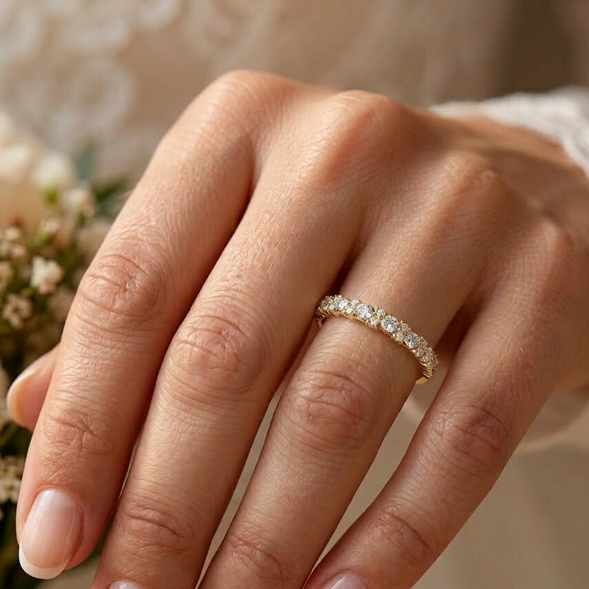 Élégante et lumineuse, cette bague demi-éternité révèle un alignement délicat de diamants ronds taille brillant, sertis avec précision dans un écrin d’or jaune poli. Chaque pierre capte la lumière et compose un ruban scintillant qui souligne la finesse de l’anneau. L’alternance subtile des diamants crée un jeu d’éclat raffiné, apportant profondeur et brillance à ce bijou intemporel.