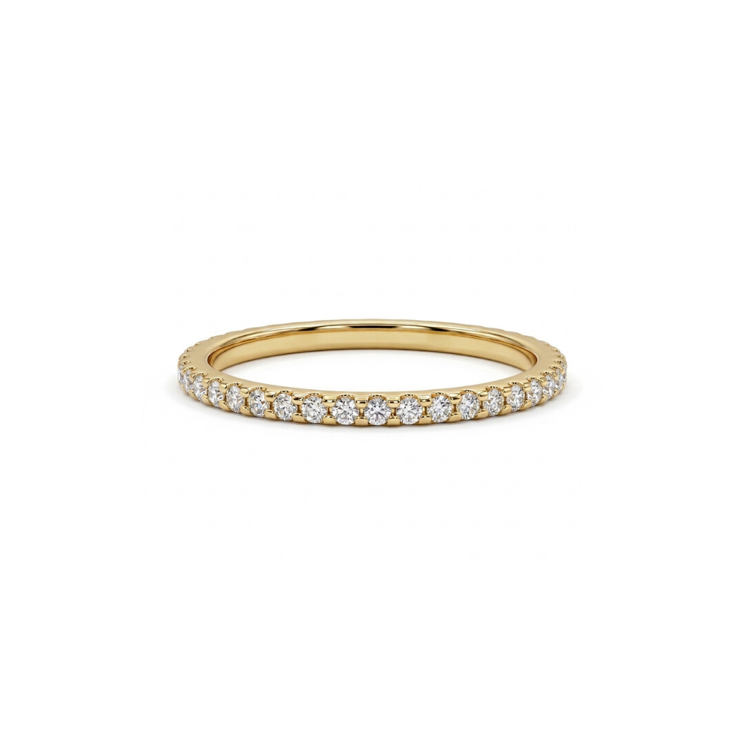 Symbole d’éternité par excellence, cette alliance en or jaune se distingue par son sertissage tour complet de diamants, offrant une brillance continue et sans interruption. Chaque pierre, finement taillée en brillant, est délicatement maintenue par un serti précis qui sublime leur éclat naturel tout en assurant une parfaite harmonie visuelle.
