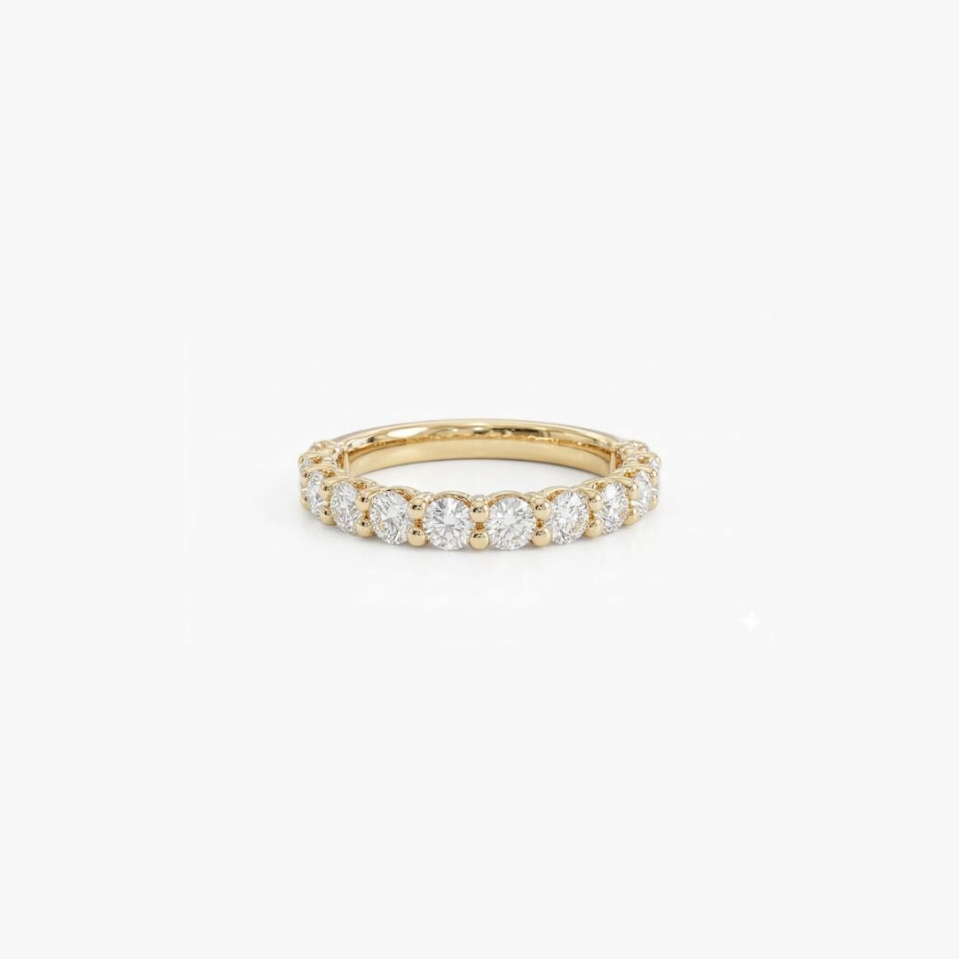 Cette bague en or jaune incarne l’élégance intemporelle et le raffinement. Son anneau délicatement poli accueille une rangée harmonieuse de diamants ronds, soigneusement sertis griffes, laissant passer la lumière pour en révéler tout l’éclat.