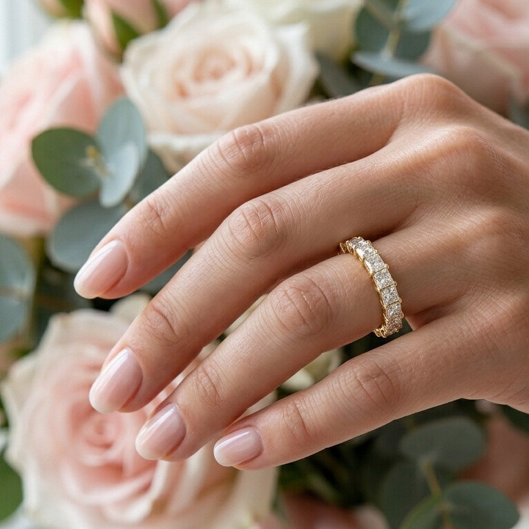 Serties avec précision dans un élégant serti rail, les pierres se succèdent sans interruption, créant un ruban lumineux d’une grande intensité. La taille princesse, avec ses facettes nettes et géométriques, capte la lumière avec caractère, révélant un scintillement à la fois franc et sophistiqué.