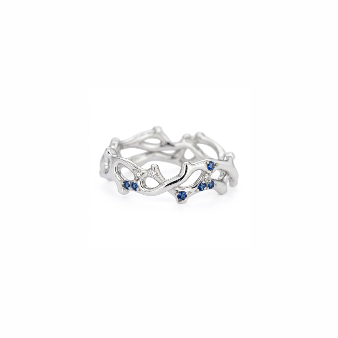 De fins diamants viennent ponctuer la structure, apportant des éclats lumineux d’une pureté remarquable. Ils dialoguent harmonieusement avec des saphirs d’un bleu profond, soigneusement sertis, qui insufflent à la pièce une touche de mystère et d’intensité.