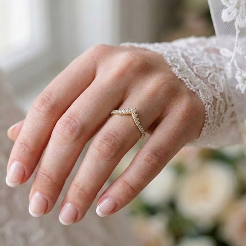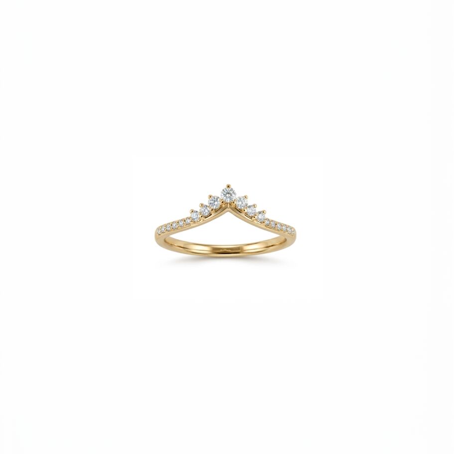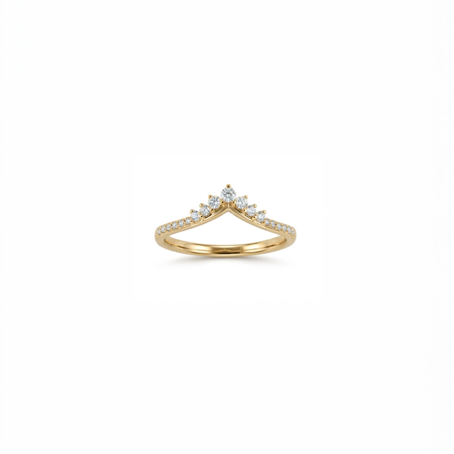 Délicate et lumineuse, cette alliance en or blanc se distingue par son élégante silhouette en V, sublimée par un motif central raffiné évoquant une couronne précieuse. Véritable symbole de grâce et de féminité, elle incarne un équilibre parfait entre modernité et inspiration joaillière classique.