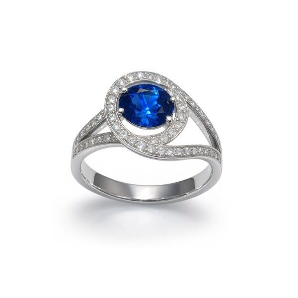Autour de la pierre centrale, une aura de diamants éclatants vient dessiner une courbe gracieuse et contemporaine. Le jeu de lignes entrelacées de la monture met en valeur la lumière et crée un mouvement délicat, reflet du savoir-faire joaillier le plus raffiné.