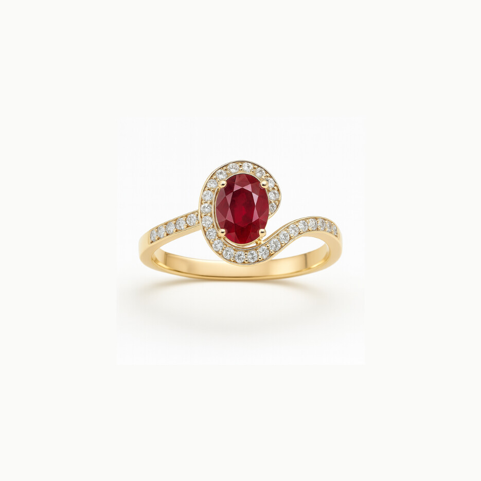 Sublime alliance d’élégance et de raffinement, cette bague en or jaune 18 carats met en lumière un rubis ovale d’un rouge profond, soigneusement facetté pour capturer et refléter chaque éclat de lumière. Sertie en position centrale, la pierre précieuse est délicatement entourée d’un ruban de diamants blancs, qui dessine une courbe fluide et contemporaine, évoquant un geste de douceur ou un mouvement naturel.