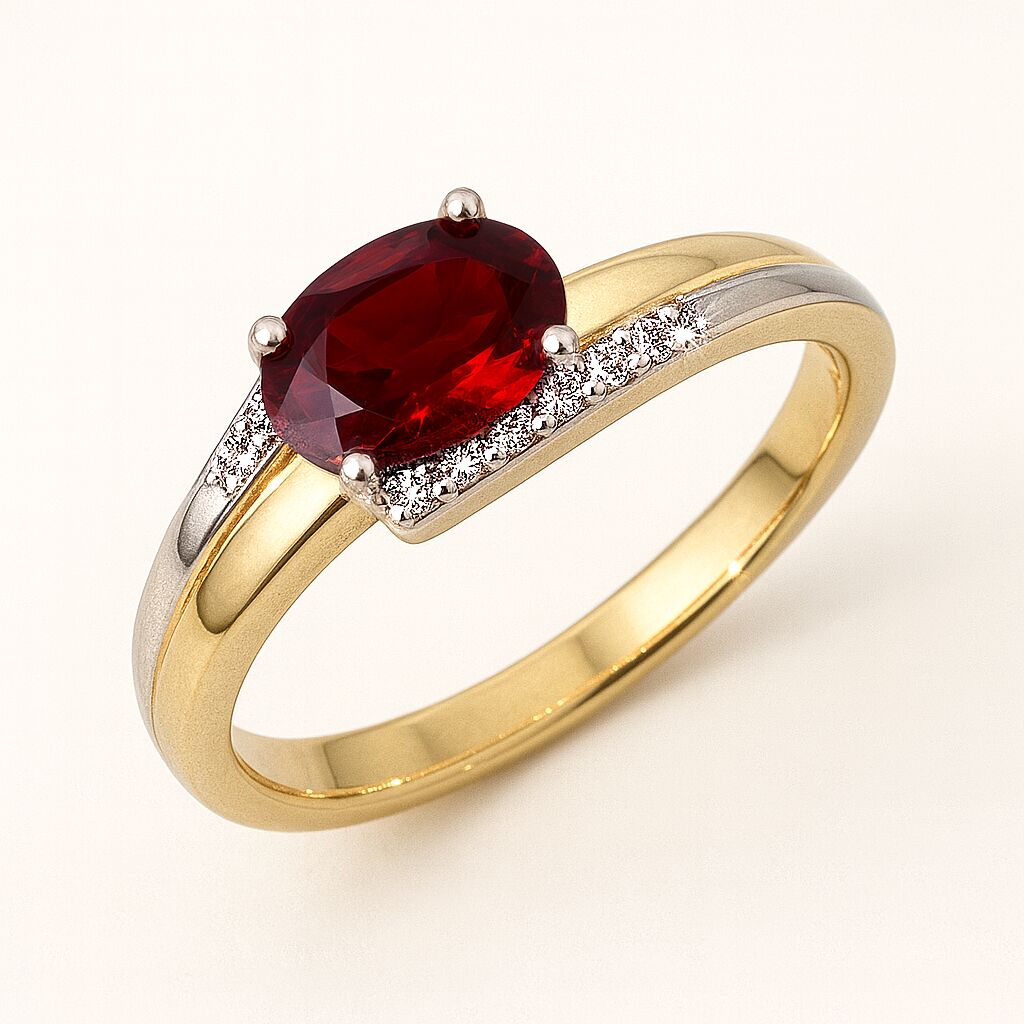 Symbole d’élégance intemporelle, cette bague en or 18 carats marie avec raffinement la chaleur de l’or jaune à l’éclat lumineux de l’or blanc. En son centre trône un rubis ovale d’un rouge profond, évoquant la passion et la noblesse. Sertie de part et d’autre de diamants étincelants, la pierre précieuse semble flotter dans une lumière cristalline, sublimée par le contraste harmonieux des deux ors.
