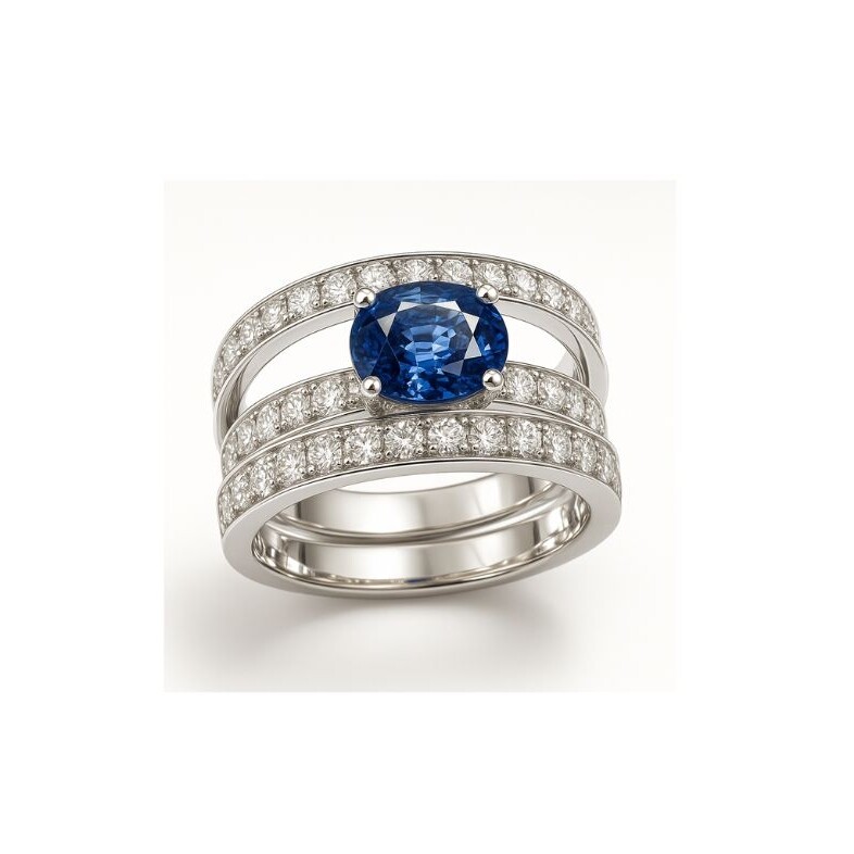Sublime création joaillière en or blanc 18 carats, cette bague contemporaine séduit par son élégance architecturale et son éclat raffiné. En son centre trône un saphir bleu ovale d’un bleu profond et lumineux, maintenu par quatre griffes fines qui mettent en valeur la pureté de la pierre.