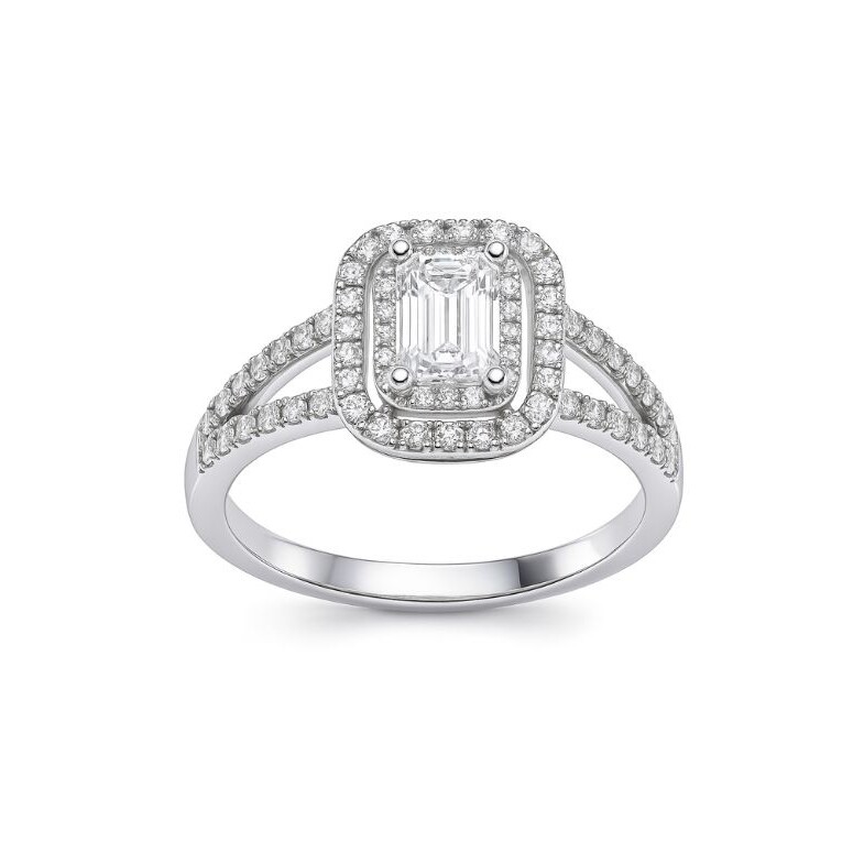 Sublimée par un design à la fois moderne et intemporel, cette bague en or blanc se distingue par l’élégance raffinée de son motif central. Au cœur de la création, un diamant taille émeraude capte la lumière avec une pureté exceptionnelle. Il est délicatement entouré d’un double halo de diamants pavés, savamment sertis pour magnifier son éclat et créer un jeu de lumière d’une intensité rare.