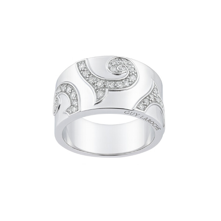 Les surfaces polies contrastent subtilement avec l’éclat miroitant des diamants, créant un effet de relief et de lumière d’une rare intensité. Large et contemporaine, cette création conjugue modernité et féminité dans une harmonie parfaite.