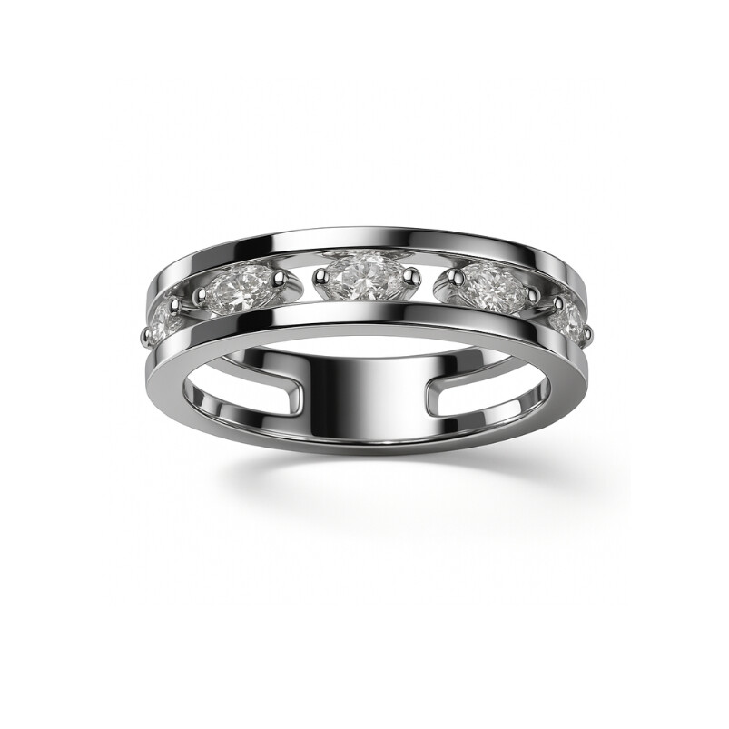 Réalisée en or blanc 18 carats, cette bague se distingue par son design ajouré, moderne et équilibré, qui révèle une ligne de diamants taille navette subtilement sertis au centre.