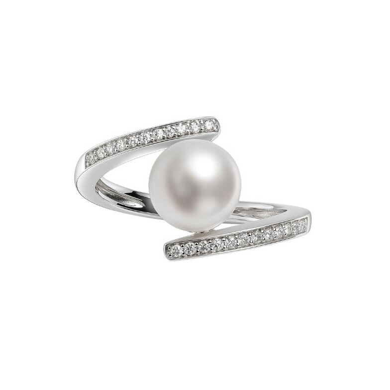Bague en or blanc au design contemporain, cette pièce met en scène une perle de culture ronde et lumineuse, délicatement posée au cœur d’un anneau ouvert. Les deux branches du corps de bague, légèrement torsadées, sont pavées de diamants étincelants qui soulignent la pureté de la perle et ajoutent une touche de raffinement précieux. L’ensemble offre un équilibre parfait entre modernité et élégance intemporelle, faisant de cette création un bijou d’exception, idéal pour sublimer les moments les plus raffinés.