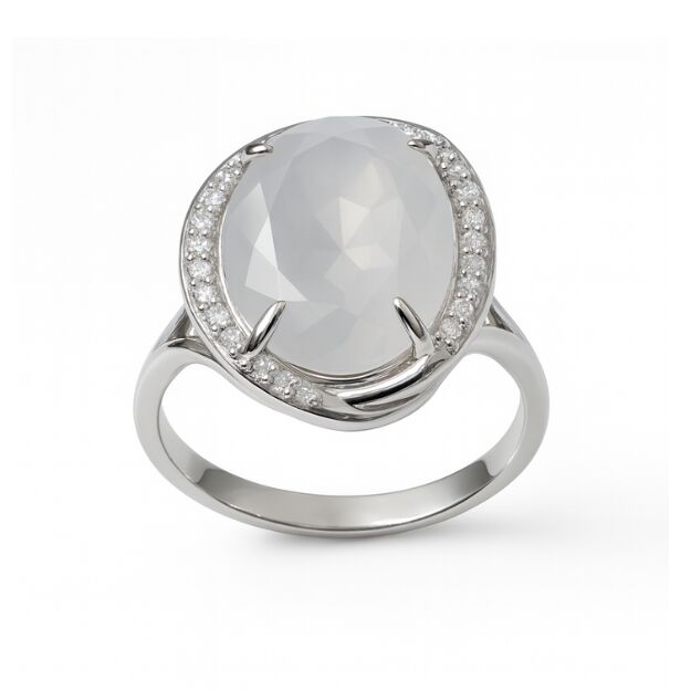 La pierre, subtilement taillée pour révéler toute sa profondeur, est sublimée par un halo de diamants ronds finement sertis, apportant une touche d’éclat à la douceur satinée du quartz.