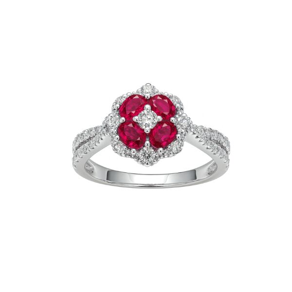 Au cœur de la monture, quatre rubis ovales d’un rouge profond forment une fleur précieuse, sublimée en son centre par un diamant taille brillant. Un halo de diamants délicatement sertis souligne la pureté de la composition et accentue la brillance du motif central.