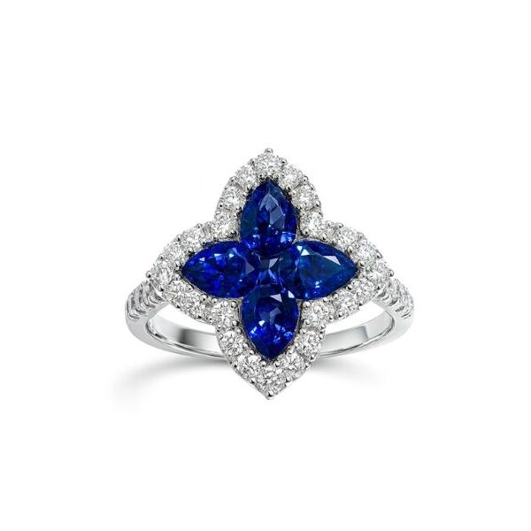 Élégante et raffinée, cette somptueuse bague en or blanc 18 carats se distingue par son motif floral d’une exquise symétrie. En son cœur, quatre saphirs taille poire d’un bleu profond se rejoignent pour former une fleur lumineuse, symbole d’harmonie et de féminité. Chaque saphir, d’une pureté exceptionnelle, est savamment serti afin de capter la lumière sous tous les angles.