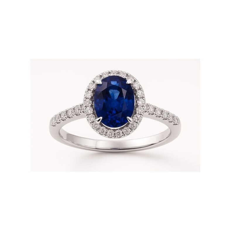 Élégante et intemporelle, cette création joaillière met en lumière un somptueux saphir ovale d’un bleu profond, dévoilant des jeux de lumière intenses à chaque mouvement. La pierre centrale est sublimée par un délicat halo de diamants ronds finement sertis, accentuant son éclat naturel et apportant une touche de raffinement supplémentaire.
