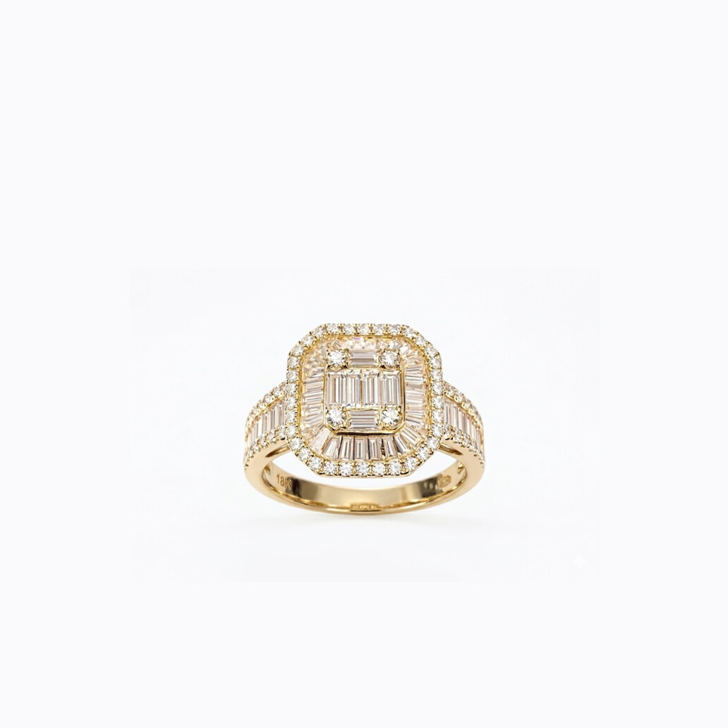 L’ensemble est sublimé par un double entourage : un premier halo de diamants baguette formant un cadre structuré, puis un second pavage de diamants taille brillant, apportant une aura scintillante et enveloppante. Les épaules de l’anneau, finement serties de pierres, prolongent cette harmonie lumineuse jusque dans les moindres détails.