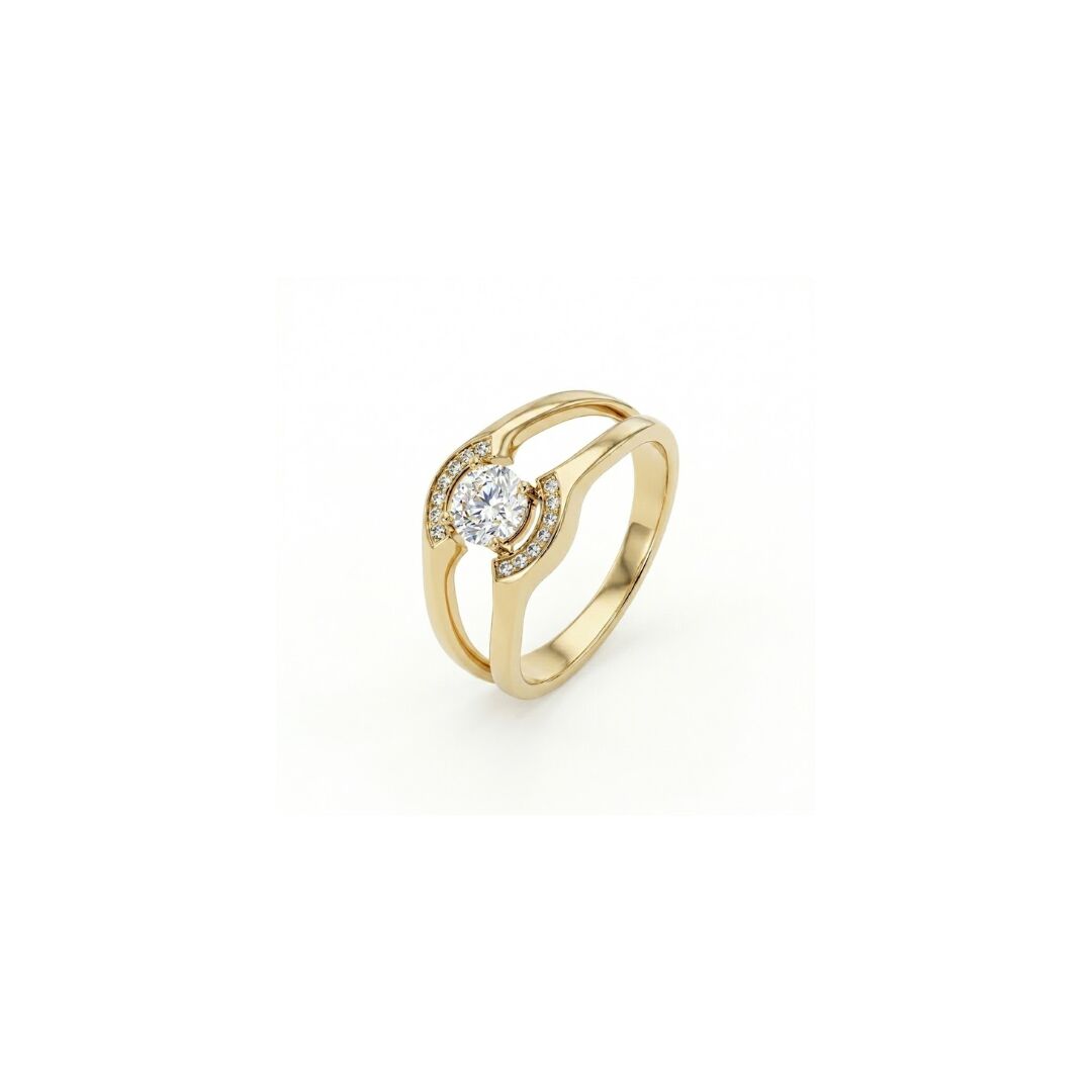 Bague élégante en or jaune 18 carats, au design délicatement ajouré et résolument féminin. Son motif central met en lumière un diamant taille brillant, serti avec finesse pour capter et refléter la lumière avec intensité.