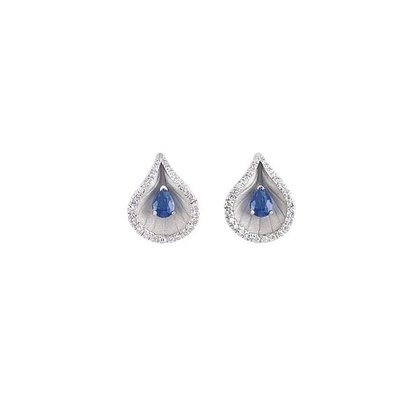 Chaque boucle est façonnée en or blanc 18 carats, dont la forme évoque une goutte fluide, subtilement sculptée pour capturer la lumière et créer un jeu de textures raffiné. Au centre, un saphir bleu taille poire révèle une teinte intense, profonde et lumineuse, véritable cœur chromatique de la création.