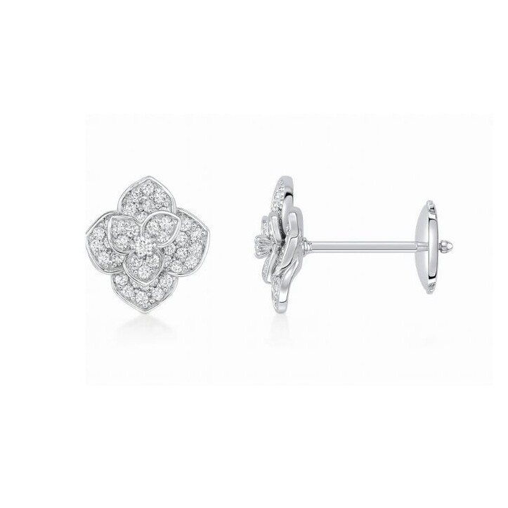 Façonnées en or blanc à l’éclat miroir, elles dessinent une silhouette florale délicate, symbole de grâce et de féminité. Chaque pétale, finement galbé, est entièrement pavé de diamants minutieusement sertis, offrant une brillance exceptionnelle et un jeu de lumière d’une grande subtilité. Le cœur de la fleur, également orné de diamants, vient parfaire l’harmonie de l’ensemble et accentuer la profondeur de l’éclat.
