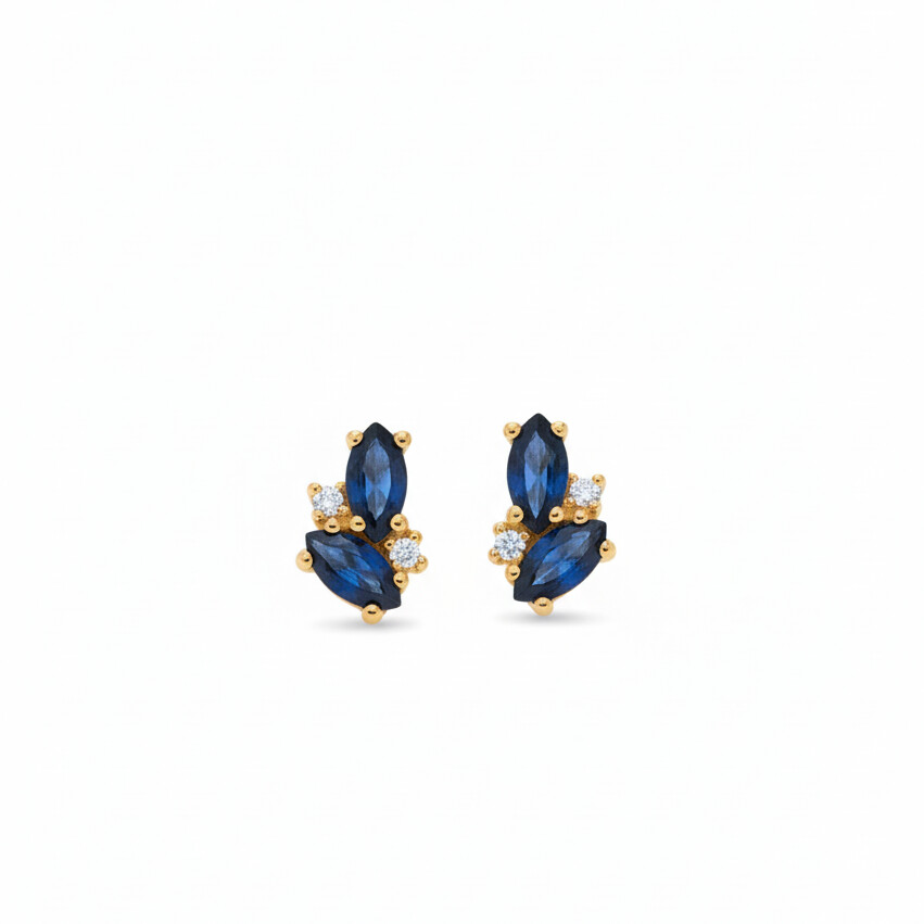 Délicates et lumineuses, ces boucles d’oreilles en or jaune 18 carats séduisent par leur silhouette élégamment structurée. Leur composition associe deux saphirs taille navette d’un bleu profond, disposés en léger éventail, créant une ligne élancée et raffinée.