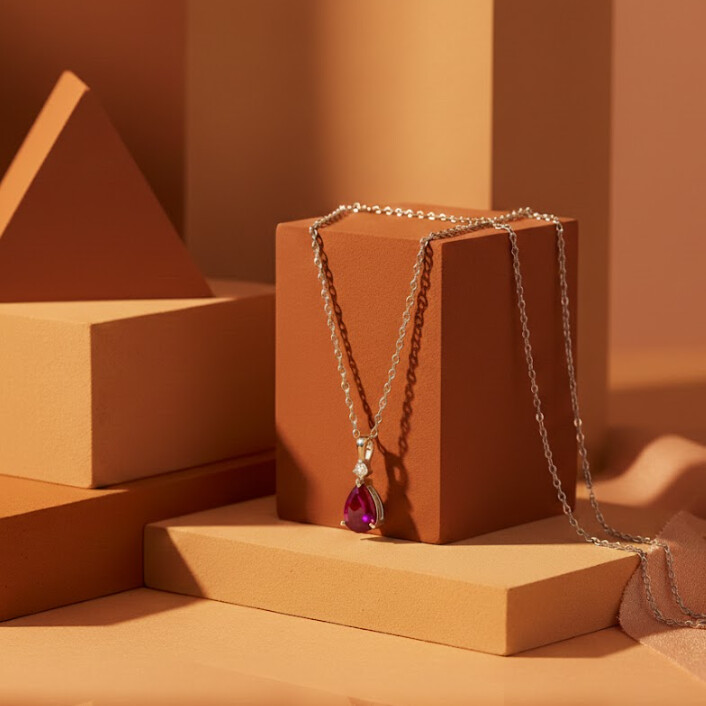 Ce collier de haute joaillerie incarne le mariage parfait entre la passion et la pureté. Sculpté dans de l'or blanc 18 carats, il met majestueusement en scène un rubis de taille poire, dont les éclats sont sublimés par la brillance éternelle d'un diamant finement serti en surplomb.