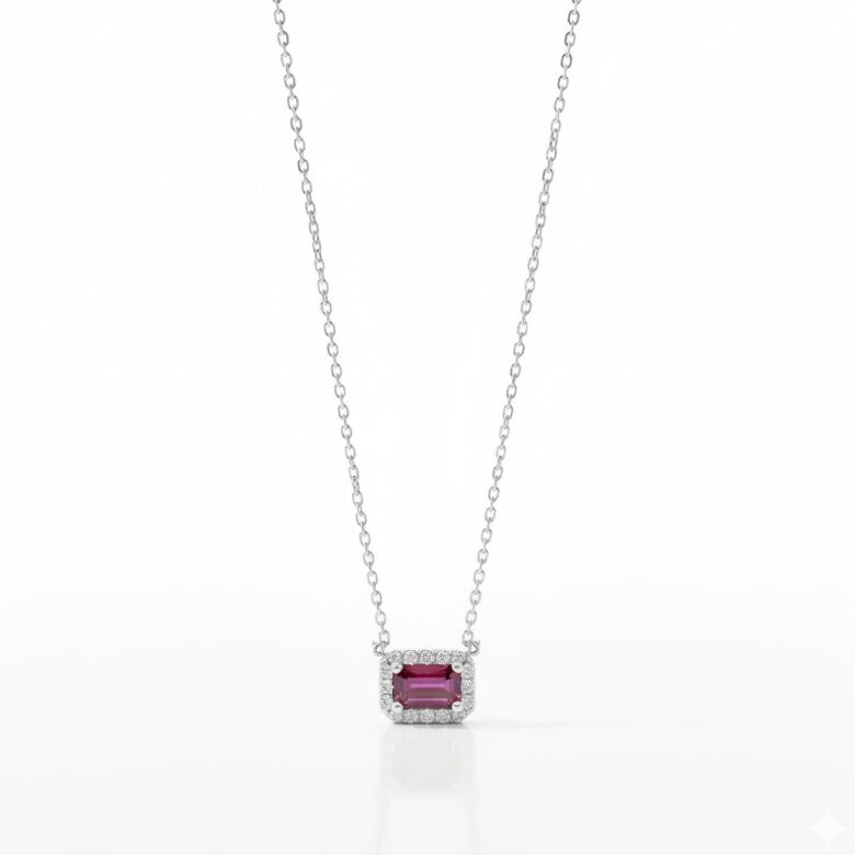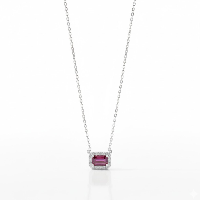 Ce collier d’exception en or blanc 18 carats séduit par l’équilibre parfait entre élégance contemporaine et raffinement joaillier. Son rubis taille émeraude, à la teinte rouge profonde et intense, est magnifié par un délicat entourage de diamants scintillants, offrant un jeu de lumière remarquable. L’éclat du métal précieux souligne avec finesse la pureté des lignes et la noblesse des pierres.