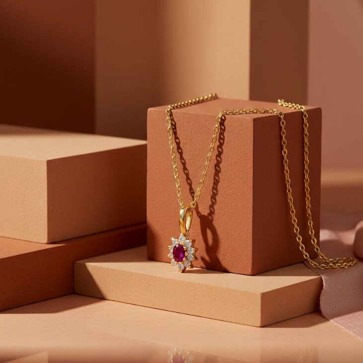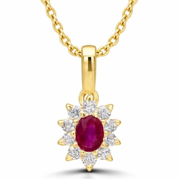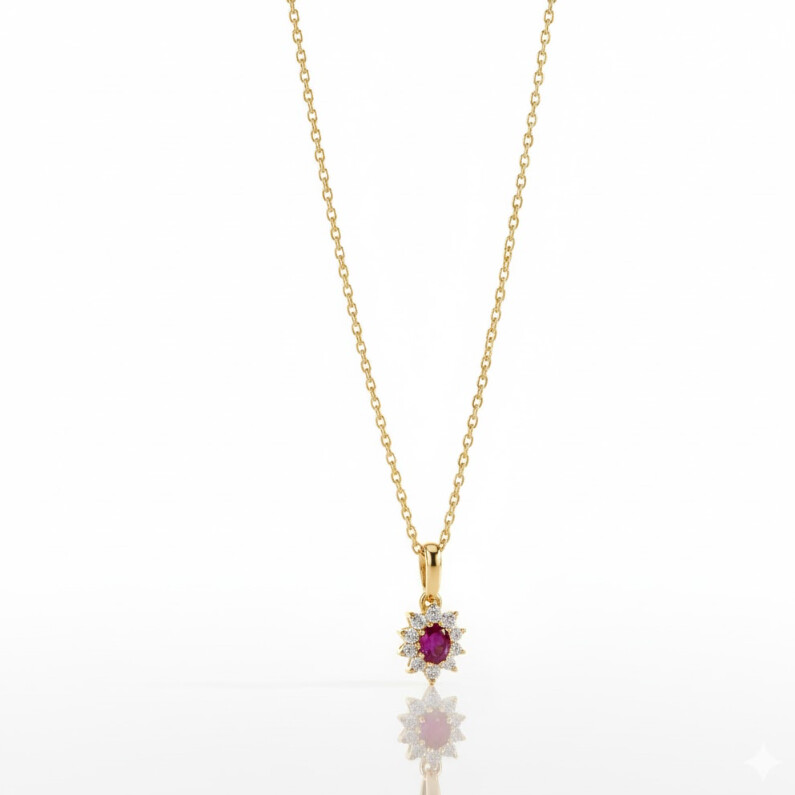 Ce collier raffiné en or jaune 18 carats incarne l’élégance intemporelle de la haute joaillerie. Au cœur du pendentif, un rubis ovale à la couleur rouge profonde révèle toute son intensité, sublimé par un délicat entourage de diamants étincelants. L’éclat chaleureux de l’or jaune met parfaitement en valeur la pureté des pierres et la finesse du sertissage.
