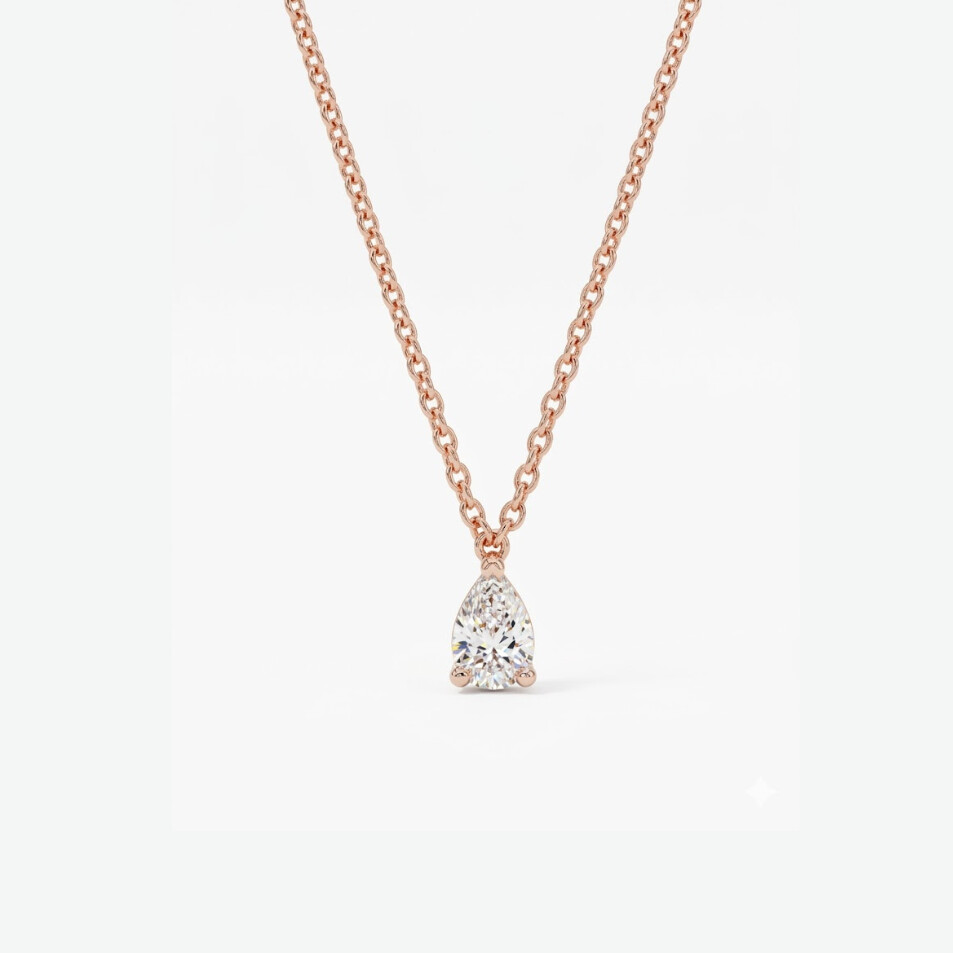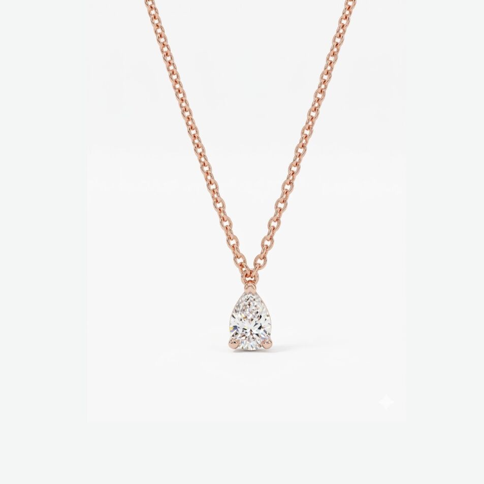 Ce collier en or rose dévoile une chaîne fine et lumineuse, subtilement travaillée pour épouser avec grâce la courbe du cou. En son centre, un pendentif délicat capte immédiatement le regard : un diamant taille poire, soigneusement serti, révèle toute la pureté et la scintillance de la pierre.