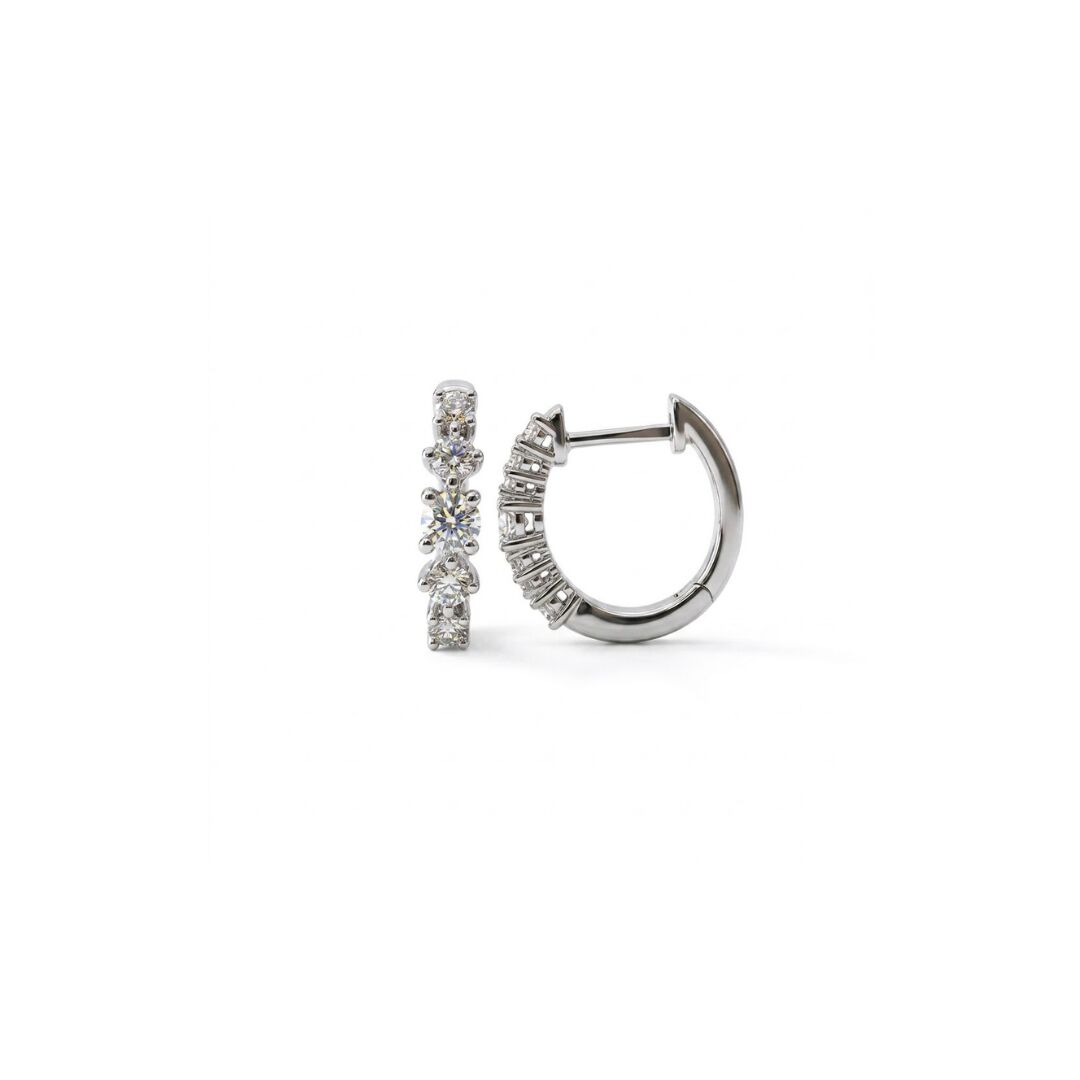 Paire de créoles en or blanc 18 carats, au design élégant et épuré. Leur ligne frontale est entièrement ornée d’une alternance de diamants taille brillant de tailles variées, créant un jeu de volumes subtil et une brillance rythmée.
