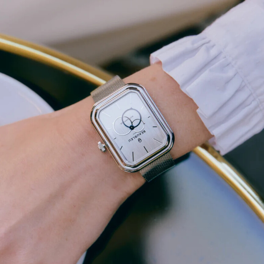 Comme taillé dans un seul bloc d’acier, Ecce Vesperal arbore un cadran brossé à la texture franche. Ses index polis s’y intègrent avec justesse, tandis que la trotteuse bleu nuit s’anime, rompant la symétrie de l’ensemble au fil des secondes qui passent. Son boîtier alternant poli et brossé, s’équipe d’une lunette concave et d’un verre en saphir qui renferme l’ensemble avec brio.