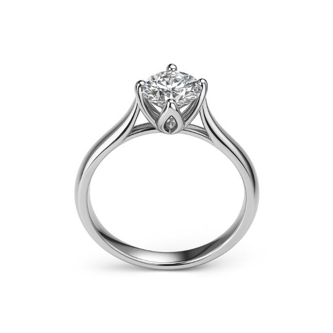 Sculptée dans un or blanc éclatant, cette bague se distingue par la pureté de ses lignes et la finesse de son design. Son anneau délicatement galbé met en valeur un somptueux diamant rond, minutieusement serti par quatre griffes en corolle qui évoquent l’ouverture d’un bouton de fleur.