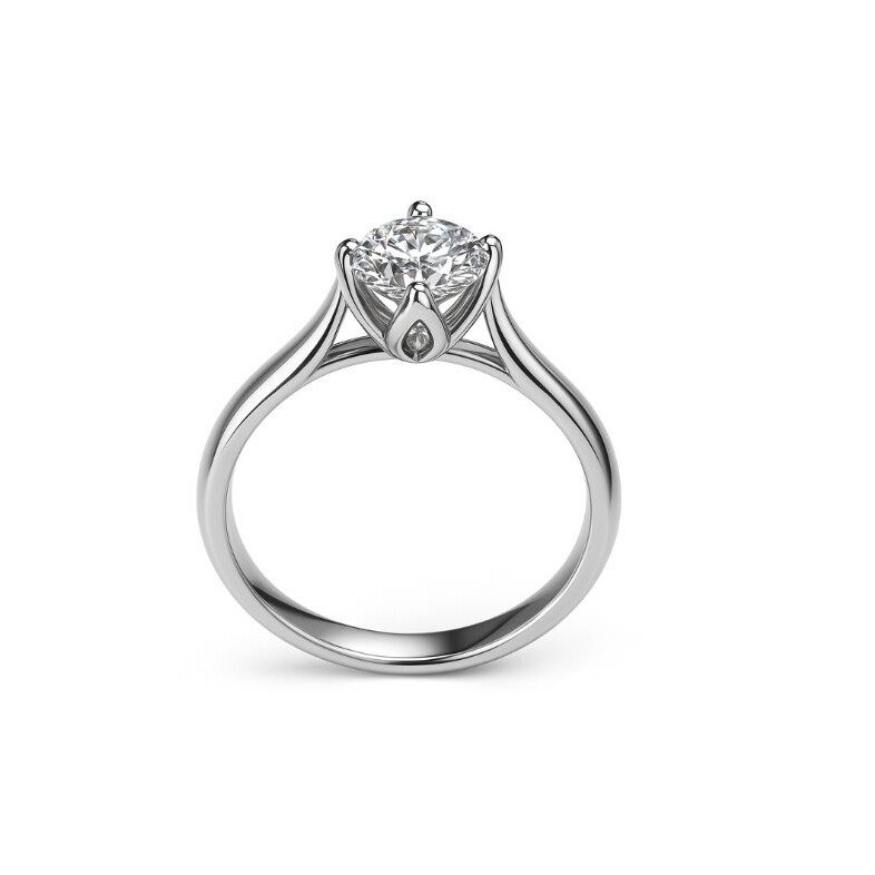 Sculptée dans un or blanc éclatant, cette bague se distingue par la pureté de ses lignes et la finesse de son design. Son anneau délicatement galbé met en valeur un somptueux diamant rond, minutieusement serti par quatre griffes en corolle qui évoquent l’ouverture d’un bouton de fleur.